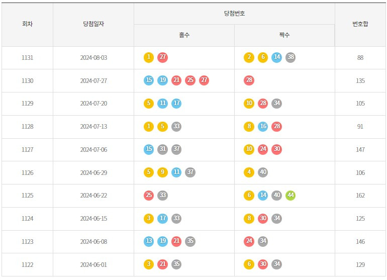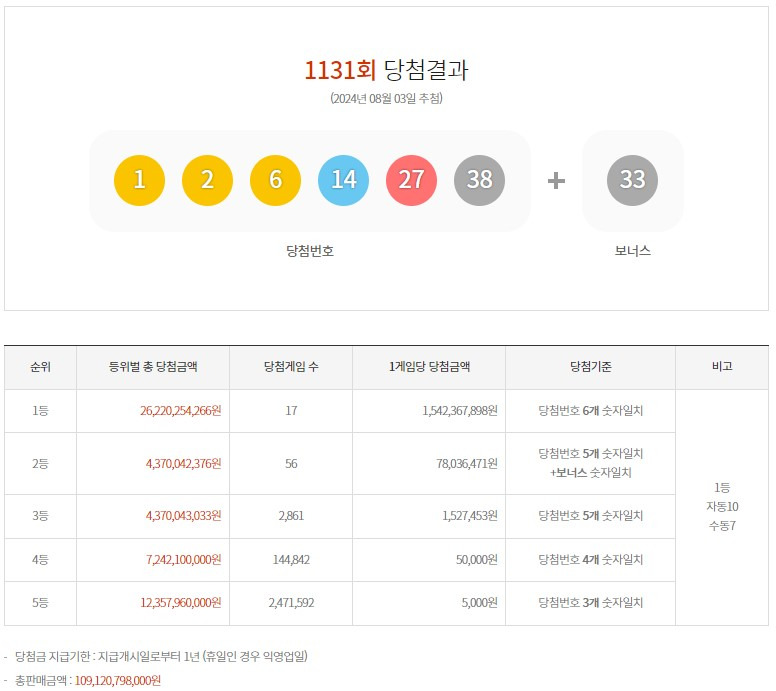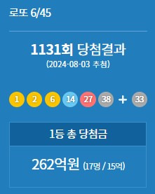 #로또1131회 2024.0803 / 17명 / 1,542,367,898원 / 1,2,6,14,27,38,33 / 2등 / 56명 / 78,036,471원