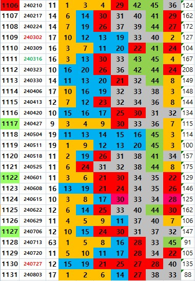 27번은 이월과 이웃수로 당첨되었고, 연속번호 1,2번 출현과 41~45번호대 3주 연속 미 출현, 각번 끝수 미 출현, 이월수 27번 출현, 이웃수로 14,27번이 출현하였다.